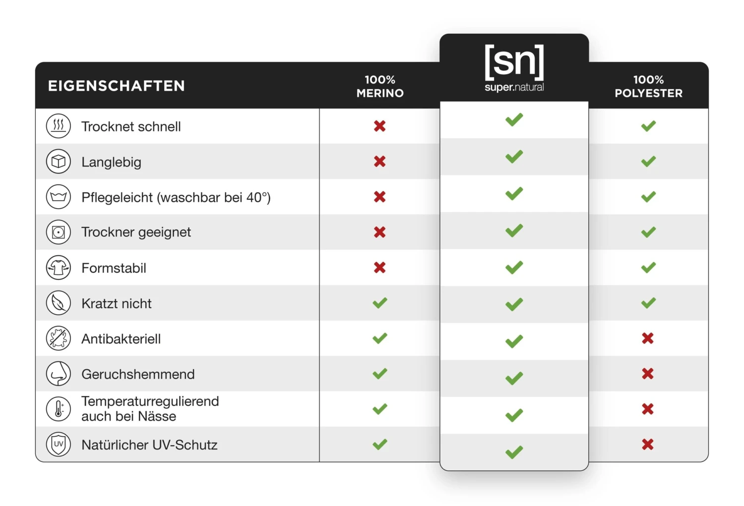 Was das Besondere an den super.natural Base Tees ist? Ganz einfach, du kannst sie sowohl als Funktionsunterwäsche, als auch im Alltag tragen. Dank dem innovativen Materialmix aus Merinowolle und Polyester gewährleisten dir die super.natural Produkte eine optimale Thermoregulation und vermeiden somit unangenehme Geruchsbildung. Auch beim Thema Pflegeleichtigkeit können die super.natural Produkte punkten, denn sie lassen sich problemlos bei 40 Grad waschen und sind sogar trocknergeeignet.