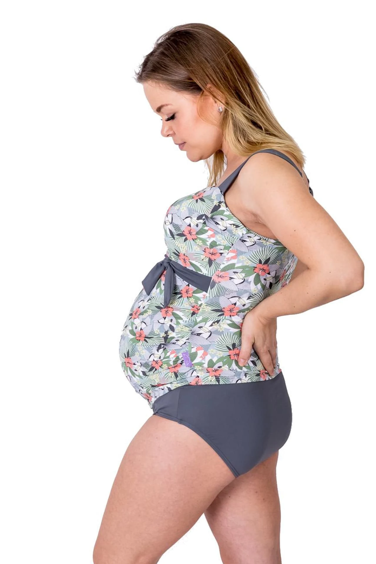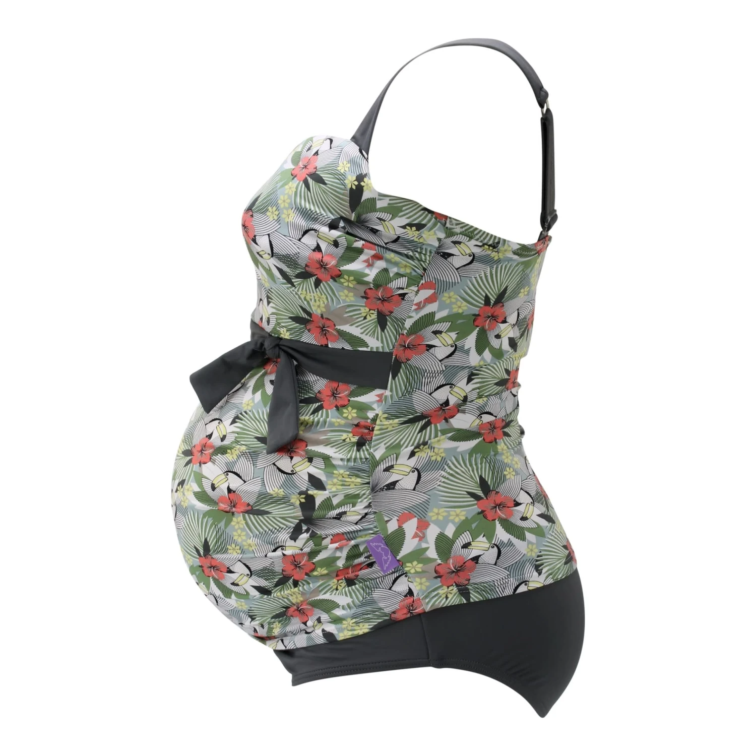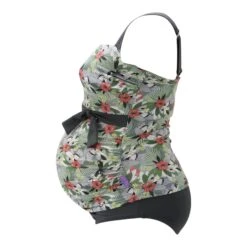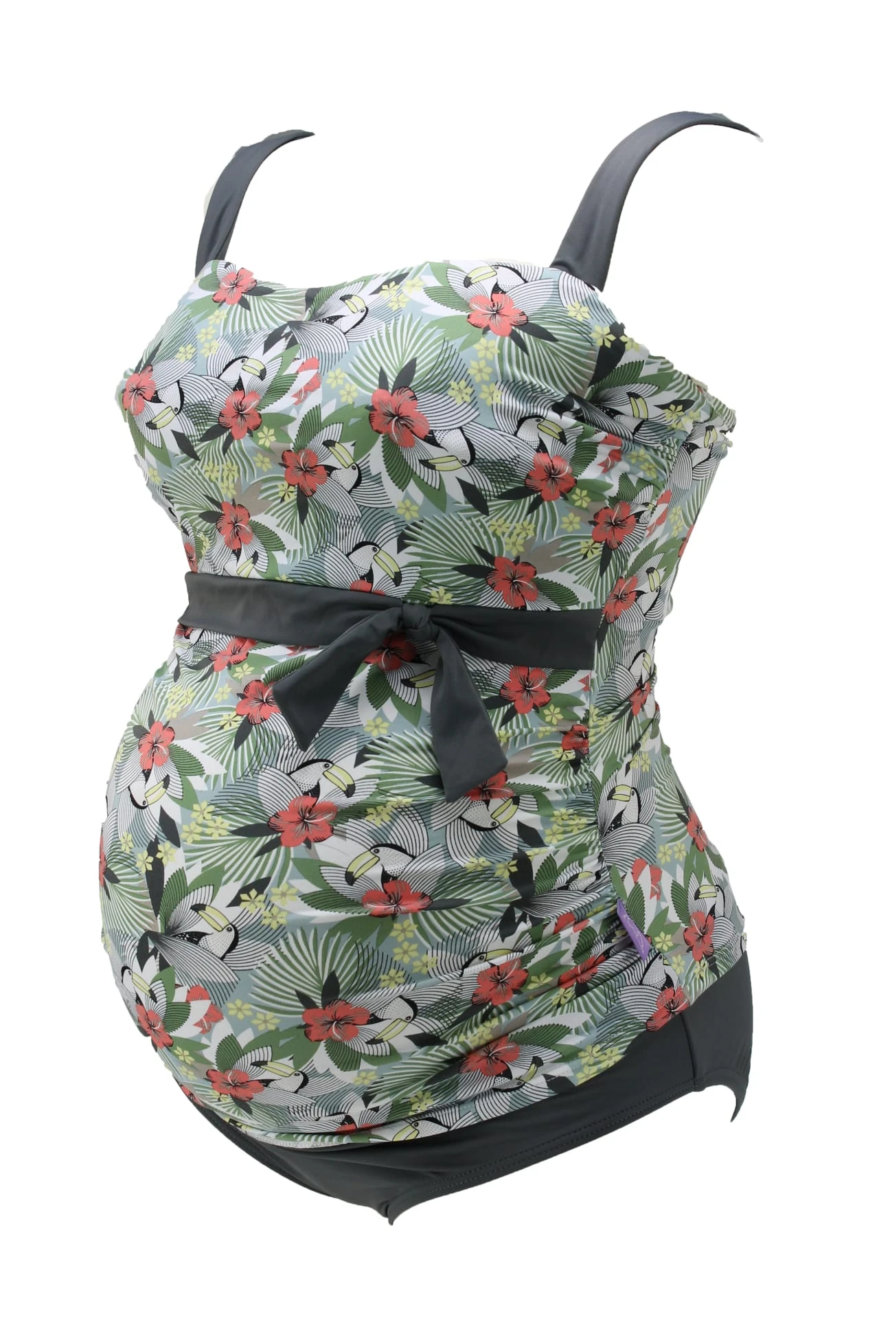 Der Umstandstankini Alena ist eine coole Kombination als Umstandstankinitop in Bandeauform in Trenddruck Hawaii-Tukan mit passendem Slip in Trendgrau. Die Körbchengrößen F und G-Cup kommen wunderbar dezent zur Geltung bei diesem Retro-Tankini in Pastellfarben mit Grau für Schwangere. Das Tankinitop ist mit 3-fach verstellbarem Bügel-BH Teil innen ausgestattet und durch die Verarbeitung von speziell für große Umstandsbadmodengrößen entwickelten Materialien verstärkt. Das Umstandstankinitop hat verstellbare, breite, weiche Träger welche einen sehr guten Halt und ein gutes Tragegefühl geben. Ein hochwertiges Silikontape liegt innen um die obere Kante des Tops und sorgt dafür, dass Nichts verrutscht. Geeignete Bügel und eine weiche, leicht gepolsterte Schale stützen die Brust in diesen großen Körbchengrößen. Die kunstvolle Schleife und die Glanzeinsätze sind ein toller Hingucker.