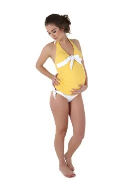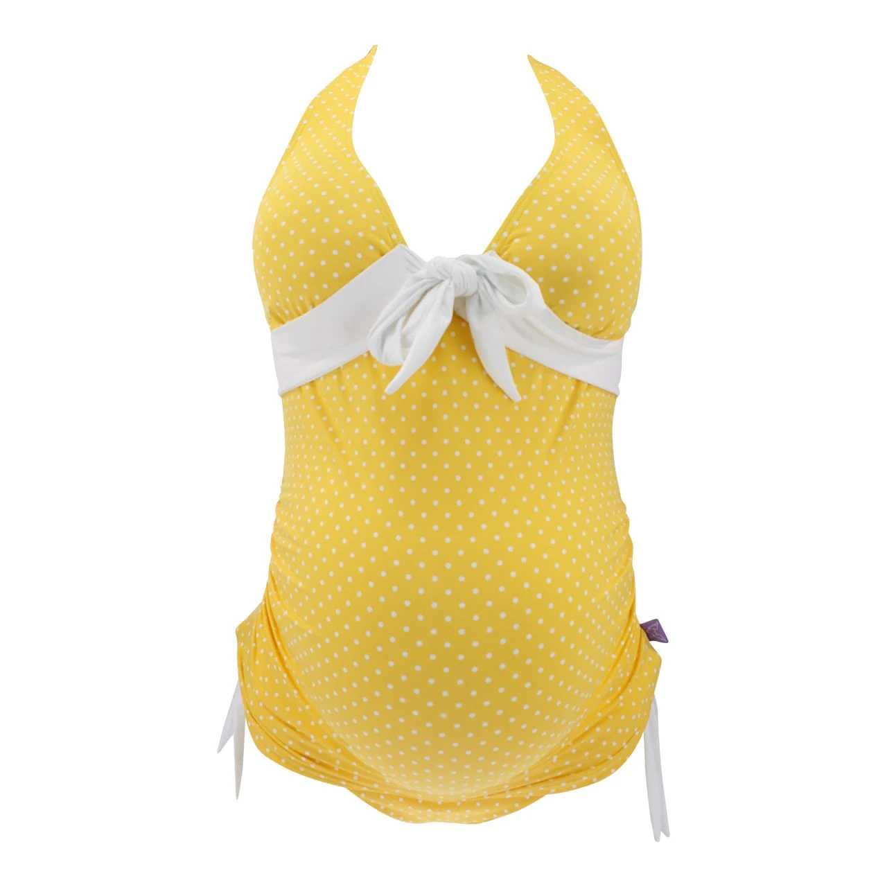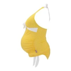 Modisch und frisch kommt dieser Umstandstankini als Halterneckvariante mit seinen hübschen Punkten daher. Das hübsch im Nacken zu bindende Oberteil verkörpert Sommer und Sonne pur und gibt einem positiven Lebensgefühl besonderen Ausdruck. Das Tankinitop für Schwangere ist ausgestattet mit herausnehmbaren, vorgeformten Polstern und einer elastischen, schön zu bindenden Verstärkung unterhalb der Brust. Diese weißen, weichen Bänder werden elegant zu einer Schleife unterhalb der Brust gebunden und geben zusätzlich Form, Design und Halt. Dezent und geschickt konstruierte Raffungen geben diesem Bikini genügend Raum und schmeicheln jeder Rundung. Aufgrund der hellen Farben haben wir diesen Tankini vorne komplett unterfüttert. Der passende Bikinislip ist zum Wenden (Pünktchen oder Reinweiß) und ist mit einer Zwischenschicht ausgestattet, so dass auch er komplett blickdicht bleibt sogar im nassen Zustand. Der Bikinislip sitzt kess auf Hüfte und ist seitlich individuell und stufenlos zum Binden. Die hochelastische, weiche und sehr feine neue Qualität, die wir seit dieser Saison einsetzen, ist schnelltrocknend und maschinenwaschbar mit ähnlichen Farben.