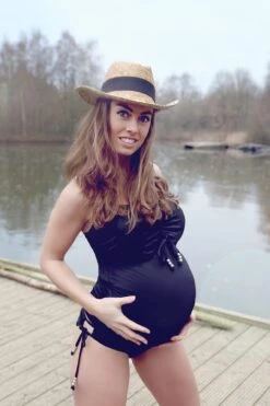 Unser Umstandstankini Bandeau-Top Cameron in F- und G-Cup Größen kommt wunderbar zur Geltung in unserem neuen edel-matten feinen Material in Schwarz und ist dezent dekoriert mit matt-silbernen Perlendetails.