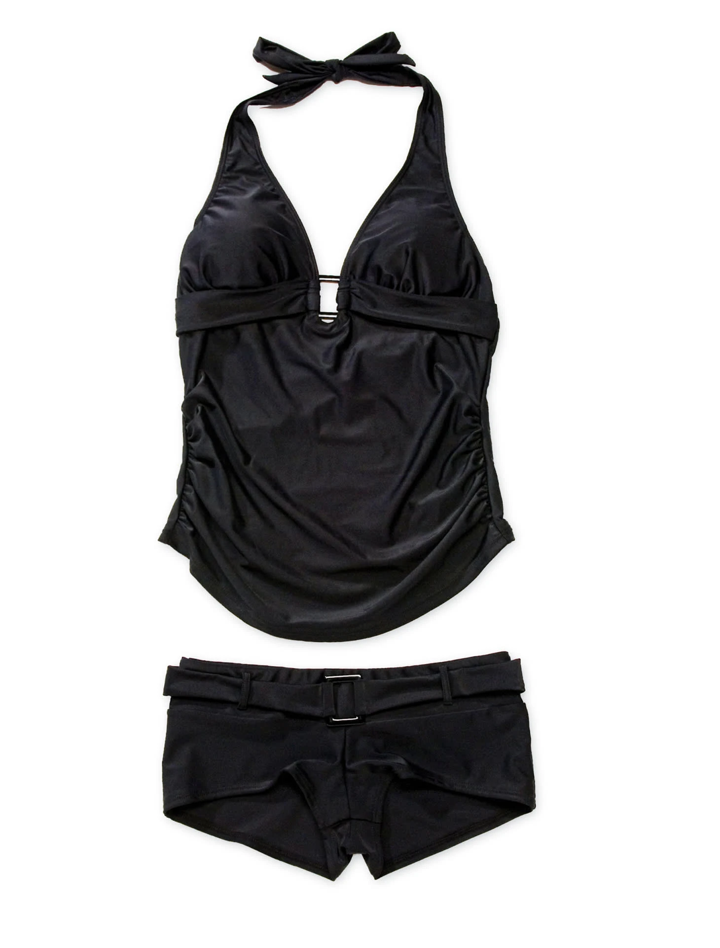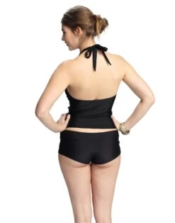 Eleganter und zeitloser Umstandstankini in klassischem Schwarz: Das Tankinitop wurde designed mit Gürteldetail und hochwertiger Schnalle, kunstvollen Fältelungen und modern als Neckholder zum Binden im Nacken. Das Tankinioberteil ist ausgestattet mit einem weichen, elastischen Bustier und nahtlosen Polstern.