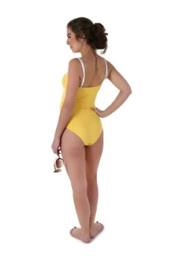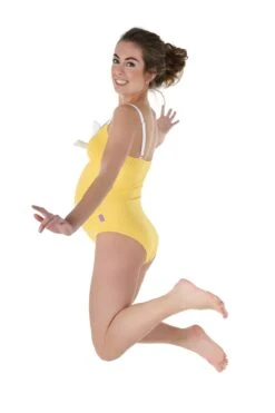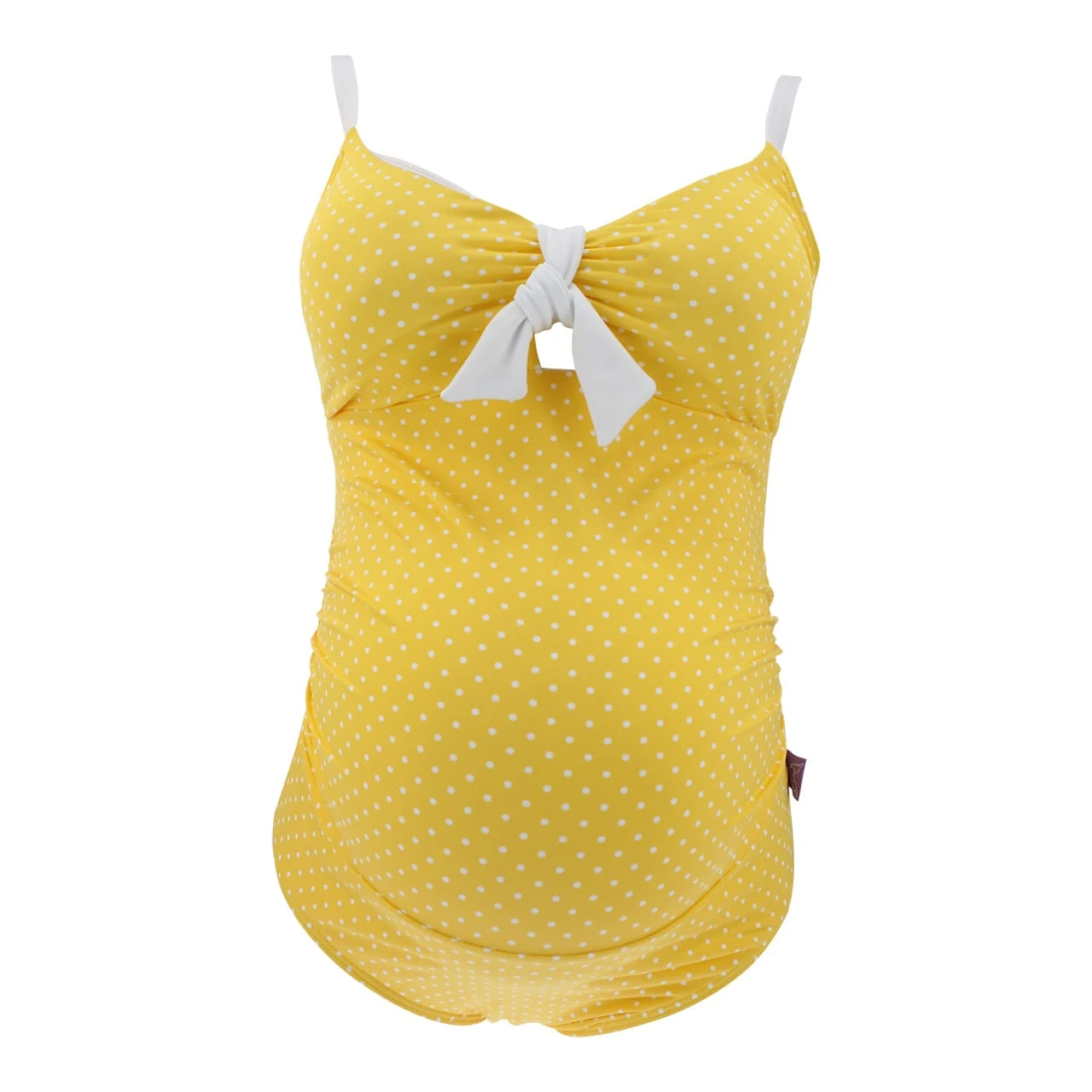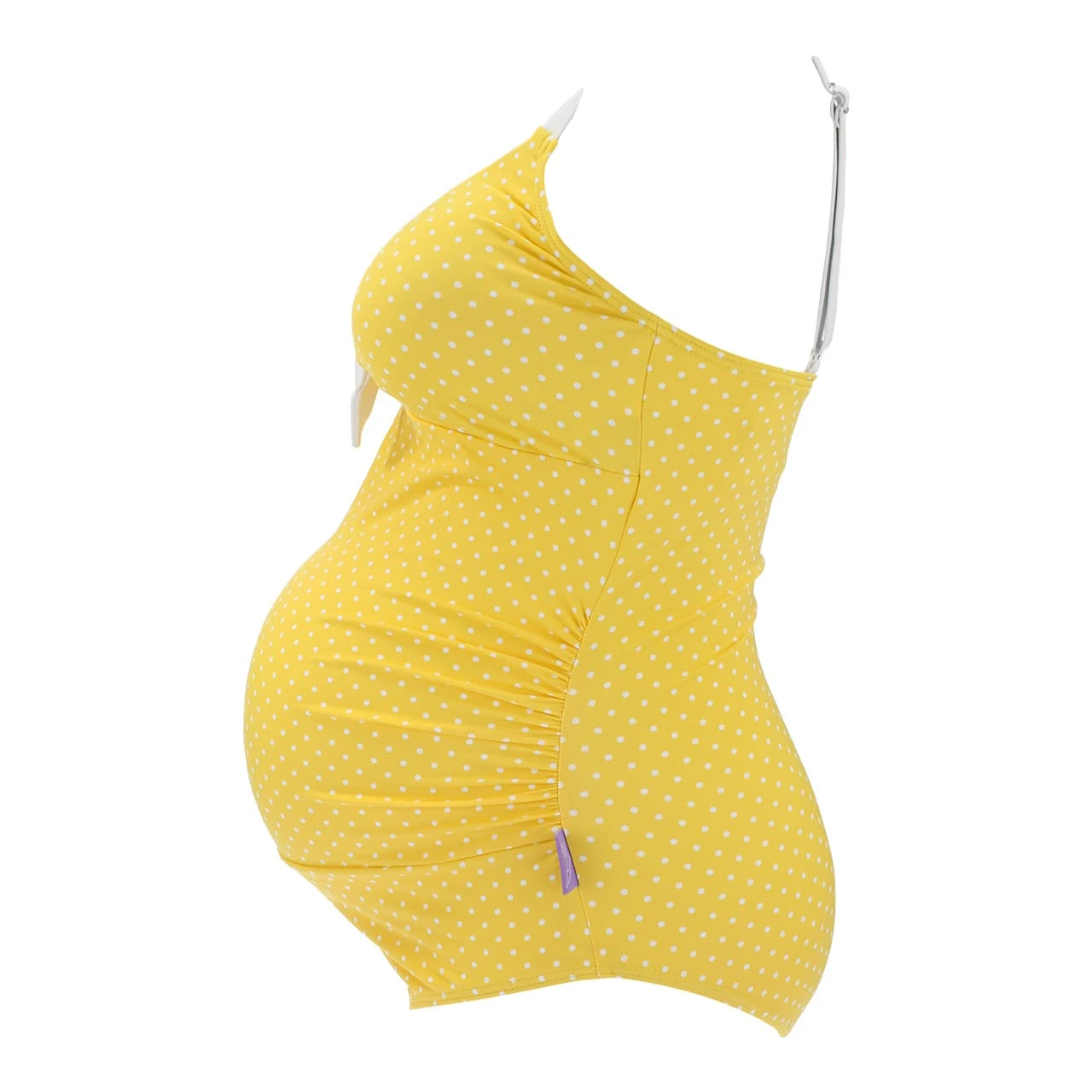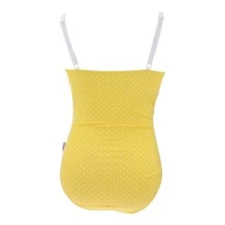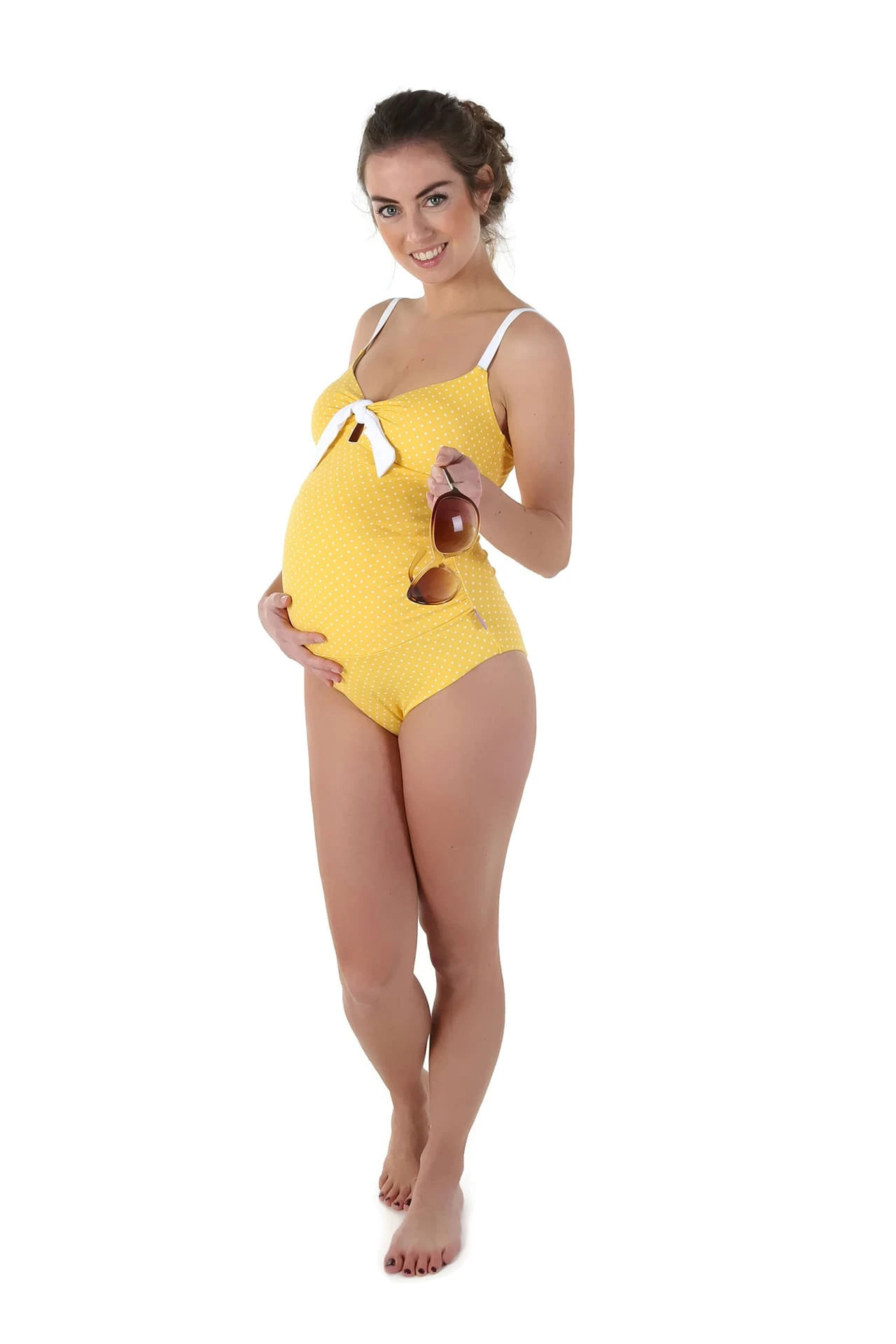 UMSTANDSBADERANZUG MACHT GUTE LAUNE in sonnigem Gelb mit weißen Pünktchen & ist modern & blickdichte Bademode von petit amour passend für Körbchengrößen B C bis D als Softcup und kommt ohne Bügel aus. Es ist der perfekte Badeanzug für Schwangere!