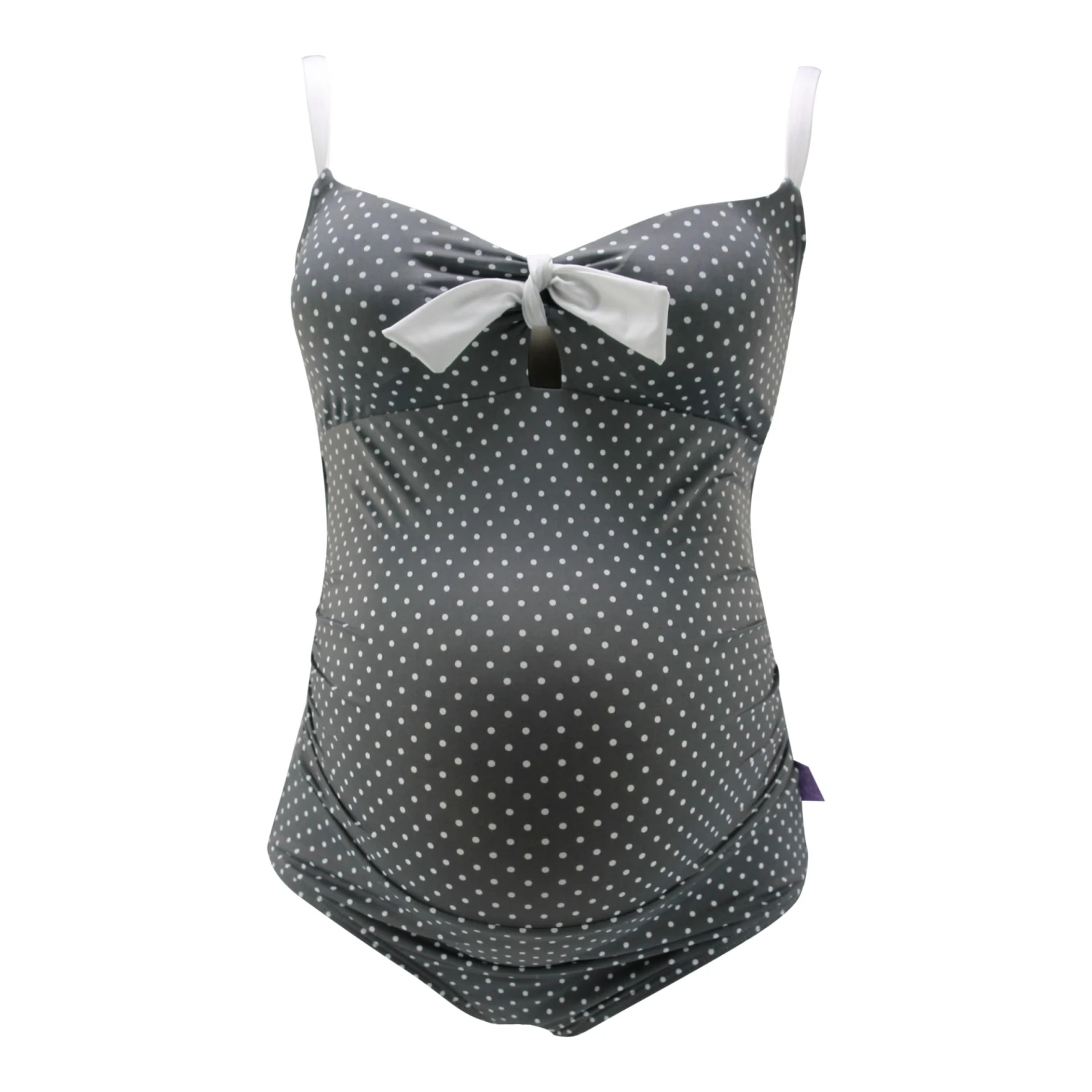 Umstandsbademode klassisch schön mit zarten weißen Details, so macht dieser Umstandsbadeanzug die Lust am Flanieren und die Vorfreude auf das Baby perfekt. Anspruchsvolles Design in Platingrau mit weißem Pünktchen passend für Körbchengrößen B C bis D Soft-Cups ohne Bügel.
