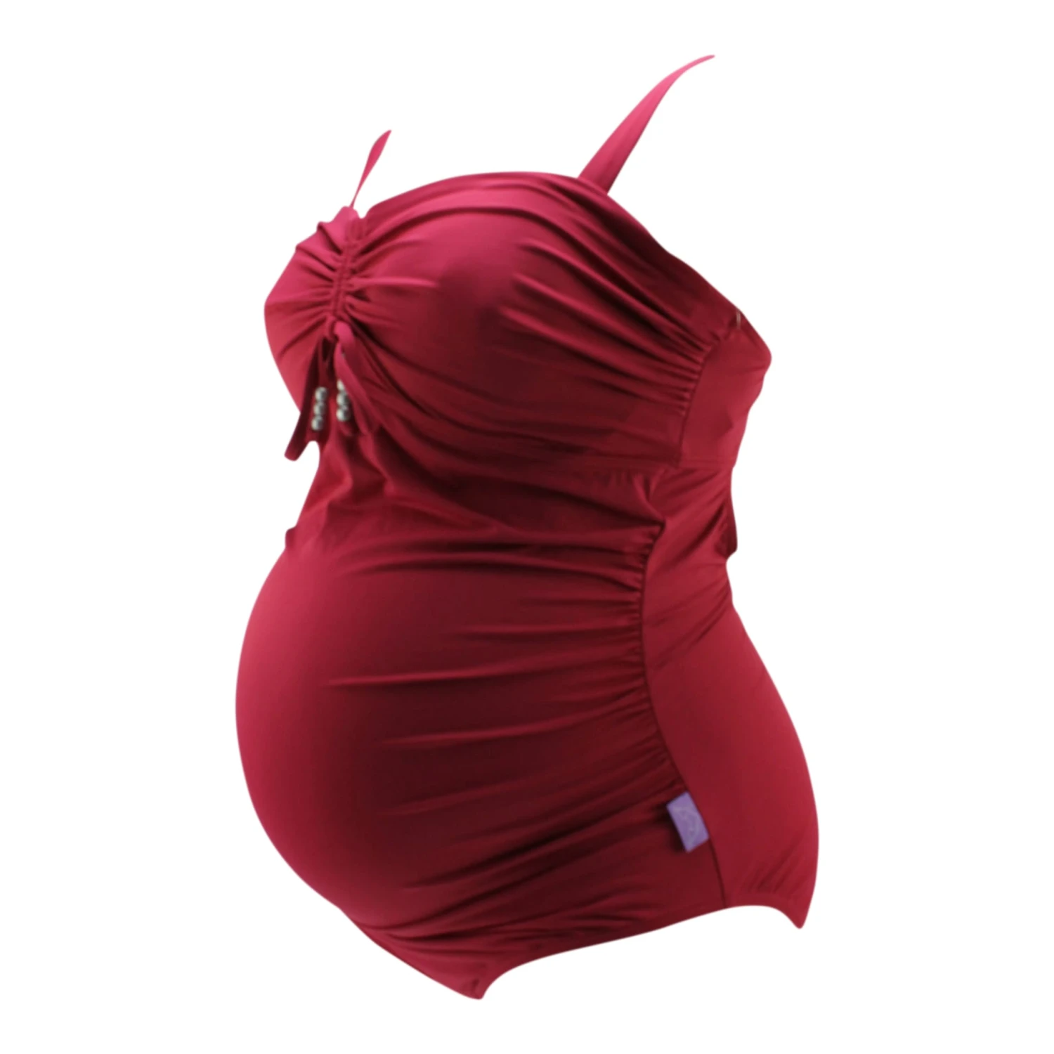 Die neue, seidig schimmernde Qualität unserer Umstandsbademode ist fein, weich, anschmiegsam und angenehm elastisch. Ein hochwertiges Silikontape liegt innen um die obere Kante des Umstandstankinioberteils und sorgt dafür, dass Nichts verrutscht. Die kunstvolle Raffung im Vorderteil ist individuell verstellbar durch den raffinierten Tunnelzug mit Bändchen. Der Rückenausschnitt ist tief und attraktiv und garantiert ein toller Hingucker.