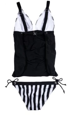 Das Oberteil des Bikinis für Schwangere ist ausgestattet mit herausnehmbaren, nahtlosen Polstern und die Träger des Bikinitops sind verstellbar und angenehm weich. In angesagten schwarz-weißen Blockstreifen passt es perfekt zur Bikinihose, welche durch edle, silberne Ringe mit Strassbesatz und einem Bändchen weitenregulierbar ist. Der Bikinislip dieser Umstandsbademode ist vorne tiefer geschnitten und somit perfekt an den schwangeren Bauch angepasst. Das schwarze Schößchen lässt sich durch silberne Druckknöpfe im Handumdrehen abknöpfen und schmiegt sich durch Raffungen schön dem Babybauch an und schützt ihn als Umstandstankini.