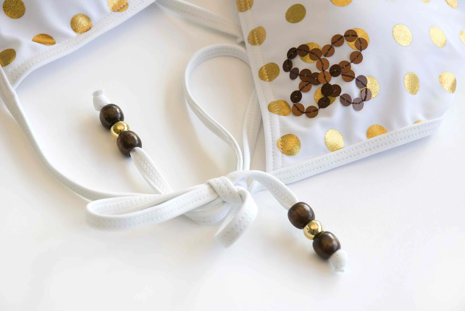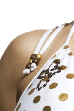 Umstandsbikini ANNA in weiß mit großen Goldtupfen weckt die Vorfreude auf einen schönen Sommer, ein Ruhestündchen auf der Liege und eine kleine Runde im Pool oder im Meer. Das Bikinitop ist liebevoll verziert mit einer kupferfarbenen Pailletten-Applikation auf der rechten Brustseite und Holzperlchen an den Bändern, mit denen das Oberteil im Nacken und Rücken gebunden wird. Das Oberteil ist gerafft und die nahlos vorgeformten Polter können herausgenommen werden, so dass zusätzlich Volumen im Cup entsteht, wenn die Brust sich vergrößert. Der Bikinislip ist vorne tiefer geschnitten und somit perfekt an den schwangeren Bauch angepasst. Seitlich gebunden ist er stufenlos verstellbar, so dass der gute Sitz auch mit zunehmenden Rundungen im Verlauf der Schwangerschaft garantiert ist.