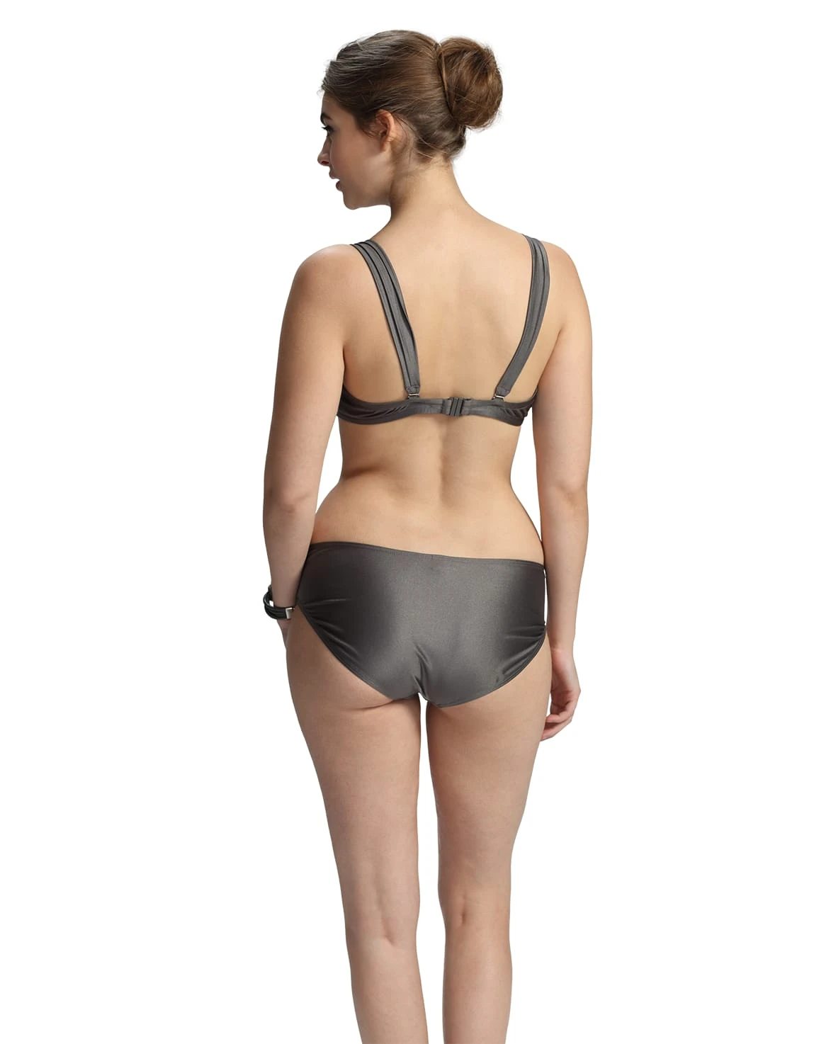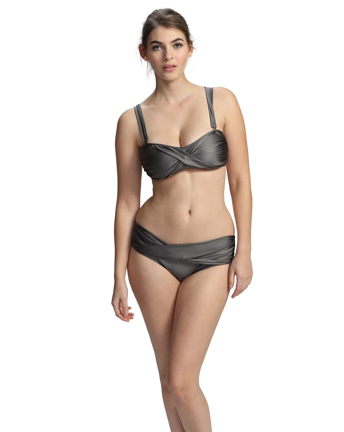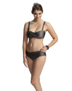 Modernes Bikinitop B- und C-Cup im Bandeau-Stil für Schwangere in angesagter Metallicoptik in der Farbe Titangrau. Die raffiniert verdrehte Verarbeitung gibt einen tollen Halt. Innen ist das Bikinitop für Schwangere mit gepolsterten Schalen ausgestattet und besondere Silicontapes stellen eine Rutschfestigkeit her.. Die breiten, konfektionierten Träger sind abnehmbar und super komfortabel. Die Panty dieser Umstandsbademode sitzt kess auf den Hüften und harmoniert aufgrund Ihrer Wickeloptik und Verarbeitung perfekt mit dem Oberteil dieses zeitlos modernen Umstandsbikinis. Das Material schimmert dezent effektvoll und edel aber nicht zuviel und ist angenehm elastisch.