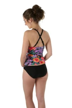 Das Oberteil ist mit hinten gekreuzten Trägern gearbeitet und die Cups dieses Umstandstankinis sind mit herausnehmbaren, vorgeformten Polstern ausgestattet. Elastische Träger sind hinten verstellbar. Der Schnitt ist vorn geschlossen konstruiert und kunstvolle Fältelungen an den Cups und in den Seitennähten geben jeder Rundung optimal Raum und trotzdem genug Halt, sowie eine schöne Form. Die passende Hipsterform als Umstandsbikinislip sitzt perfekt auf Hüfte und ist in Schwarz ein perfekter Kontrast zu den leuchtenden Farben. Dieser raffinierte Umstandstankini besteht aus hochelastischer, innovativer und weicher, feiner Qualität, welche schnell trocknet und sogar in der Maschine mit ähnlichen Farben waschbar ist.