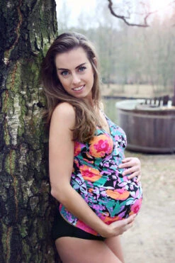 Dieses Umstandstankini-Set kommt, abgesetzt mit Schwarz, im wunderschönen Großblumendruck voll zur Geltung: Passend für Körbchengrößen B bis C mit Soft-Cups ohne Bügel ist es eine raffinierte Umstandsbademode. Fällt klein aus, bitte eine Größer größer bestellen.